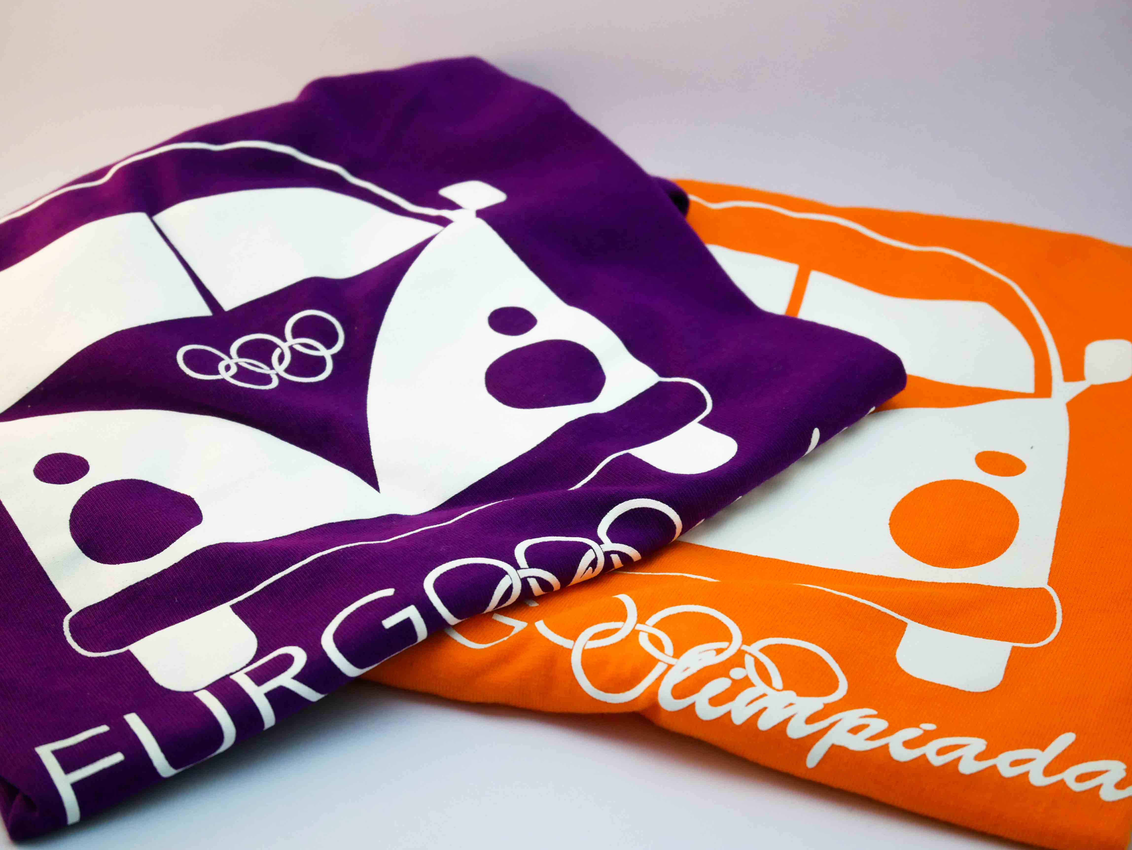 Para todos los asistentes interesados encargamos camisetas azul cian con la serigrafía de las furgoolimpiadas y para todos los organizadores, como si fuéramos los aros olímpicos, solicitamos las mismas camisetas pero en diferentes colores.